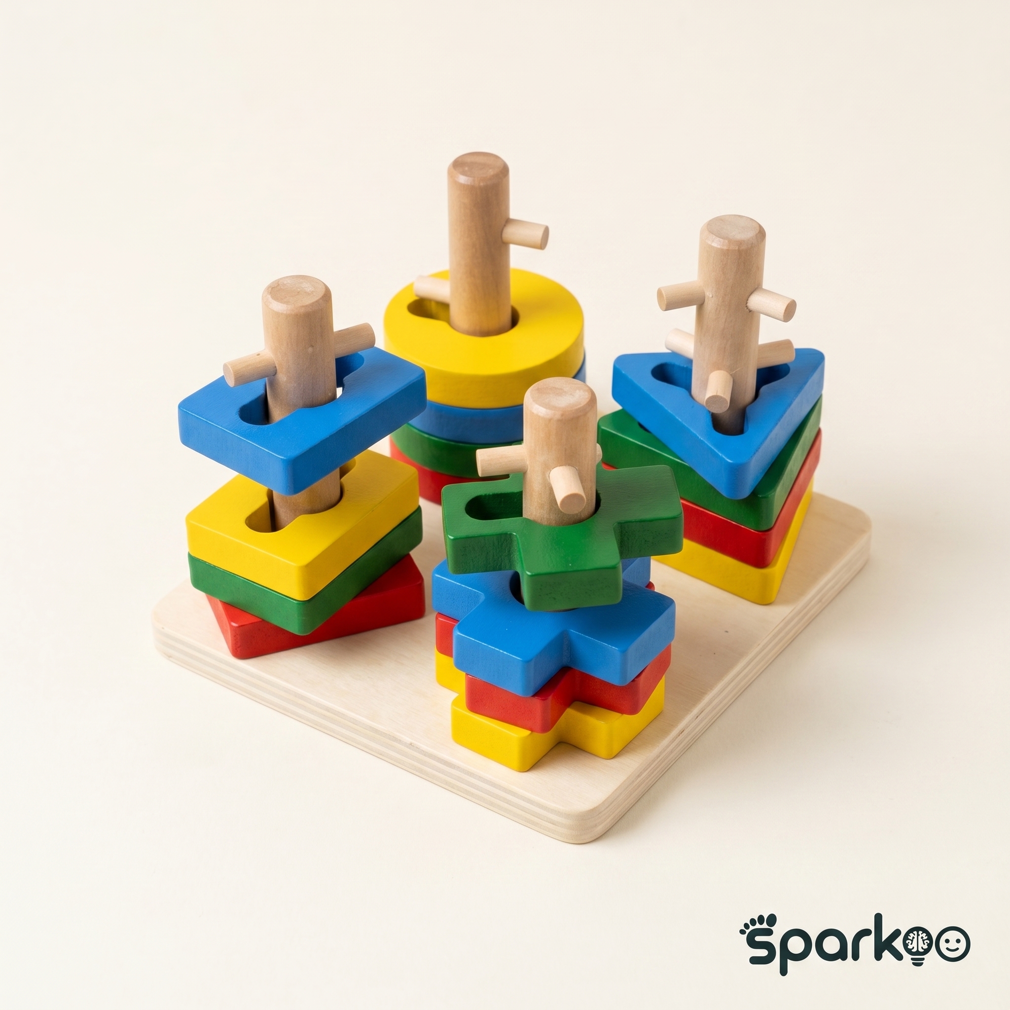 Sparkoo Wooden Geometric Tower শিশুর Shape Recognition ও Problem Solving দক্ষতা বিকাশের জন্য একটি চমৎকার Montessori-inspired Stacking Toy। ৪টি আলাদা Peg-এ Square, Circle, Triangle ও Cross — চারটি ভিন্ন Geometric Shape-এর রঙিন Wooden Pieces সঠিক Peg-এ মিলিয়ে Stack করতে হয়। এই Shape Sorting Activity শিশুর Logical Thinking, Fine Motor Skills ও Color Recognition একসাথে বিকাশ করে। Sturdy Wooden Base ও Non-Toxic Paint ব্যবহারে তৈরি, টেকসই ও শিশুর জন্য সম্পূর্ণ নিরাপদ। ২ বছর বা তার বেশি বয়সী শিশুদের জন্য আদর্শ একটি Early Learning Toy।